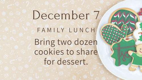 Join us for our December Family Lunch. Click the link below to let us know which cookies you plan to bring and to see any special instructions.